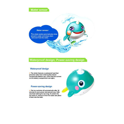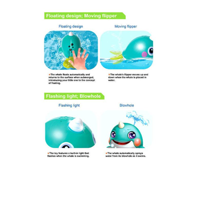 همچنین این نهنگ توانایی شنا بر روی آب و شیرجه به زیر آب را دارد و می تواند از بالای باله ی خود آب را به بیرون پرتاب کند و به محض اینکه آن را داخل آب می اندازید اسباب بازی روشن شده و شروع به شنا کردن می کند و از روی سر آن ، آب به صورت عمودی به بیرون می آید و کودک شما را سرگرم می کند.