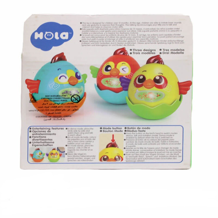 این محصول آموزشی بسیار زیبا و سرگرم کننده به شکل یک جوجه تازه از تخم درآمده طراحی شده است که بر روی سر او یک دکمه به شکل کاکل وجود دارد و از طراحی و رنگبندی شاد و کودکانهای به رنگ آبی، سبز و قرمز برخوردار است. از قابلیتهای ویژه این اسباب بازی میتوان به قابلیت پخش صدا و موزیک اشاره کرد که موجبات شادی و تفریح کودک را فراهم میکند. این محصول به وسیله باتری قلمی که در زیر آن قرار میگیرد روشن شده و شروع به کار میکند.