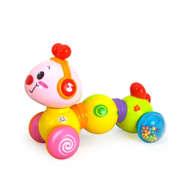 نحوه کارکرد کرم خزنده هولی تویز برای حرکت کرم موزیکال هولی تویز مدل ۹۹۷، از مکانیزم و روش بسیار جالبی کمک گرفته شده است. با فشار دادن بر روی قسمت میانی کرم و هل دادن آن به سمت پایین و سپس رها کردن، کرم با سرعتی قابل توجه شروع به حرکت می نماید. این نوع حرکت برای کودکان بسیار هیجان انگیز می باشد. جالب است بدانید چرخهایی که در این اسباب بازی بکار رفته به صورت جغجغهای می باشند. جغجغه باعث میشود که در حین حرکت کرم موزیکال تولید صدا شده و جذابیت بازی با این کرم را برای کودکان بیشتر میکند. کرم خزنده هولی تویز چند عدد باتری نیاز دارد؟ این اسباب بازی به ۳ عدد باتری ۱٫۵ ولتی جهت روشن شدن چراغها و پخش موزیک دارد. ذکر این نکته لازم است تا بدانید که حرکت کرم هولی تویز تنها با نیروی دست و به صورت مکانیکی می باشد. در سر کرم موزیکال هولی تویز از چراغهایی رنگارنگ و زیبا استفاده شده است. وجود این چراغ ها میتواند به تقویت چشم و حس بینایی کودک شما کمک کند.